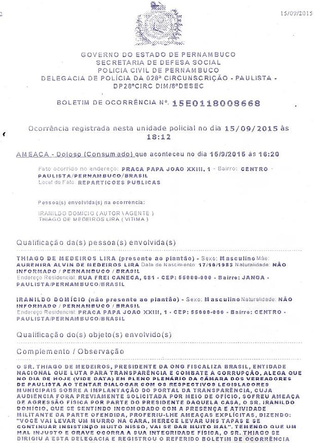 Após protocolar uma solicitação com o objetivo de dialogar com os legisladores municipais da Cidade do Paulista, o presidente fundador do Fiscaliza Brasil-FISBRA, Thiago Lira, sofreu agressões por parte do presidente da Câmara dos Vereadores da Cidade do Paulista, o senhor Iranildo Domíncio, com o testemunho de todos os outros parlamentares presentes na seção de ontem, 15/09/15, que nada fizeram.